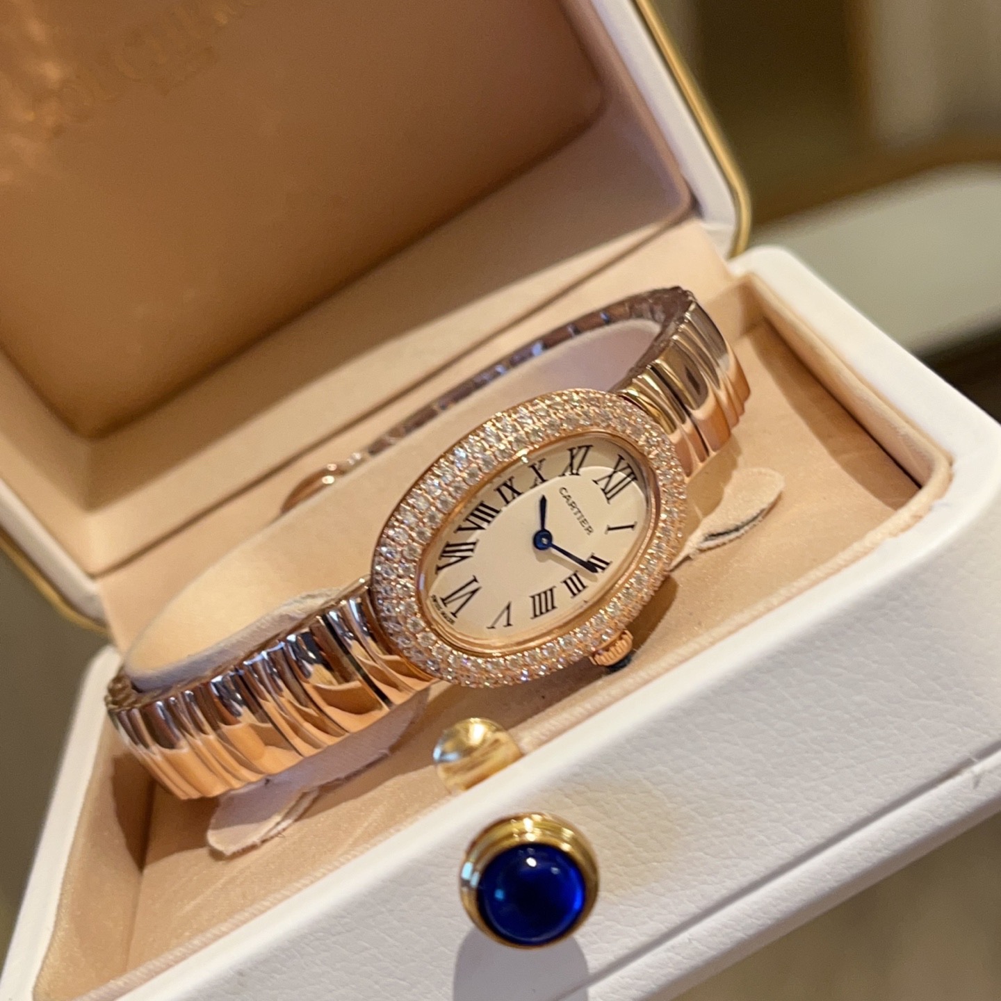 This color combination works seamlessly across occasions: paired with a white leather strap, it exudes soft sophistication for daytime meetings; matched with a gold metal bracelet, it elevates evening looks with subtle glamour. The cabochon sapphire crown adds a tiny pop of deep blue to the mix, tying together the white, gold, and blue tones for a balanced, cohesive design that stays true to Cartier’s iconic aesthetic.