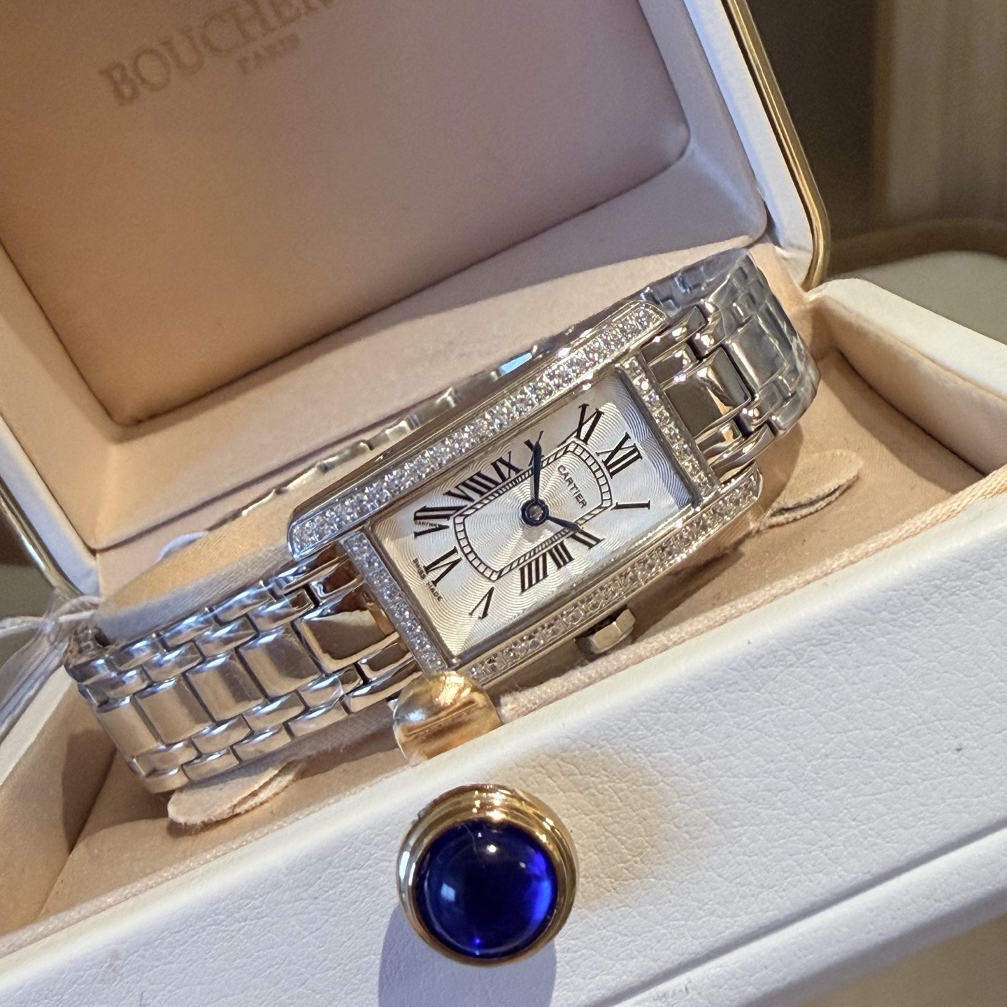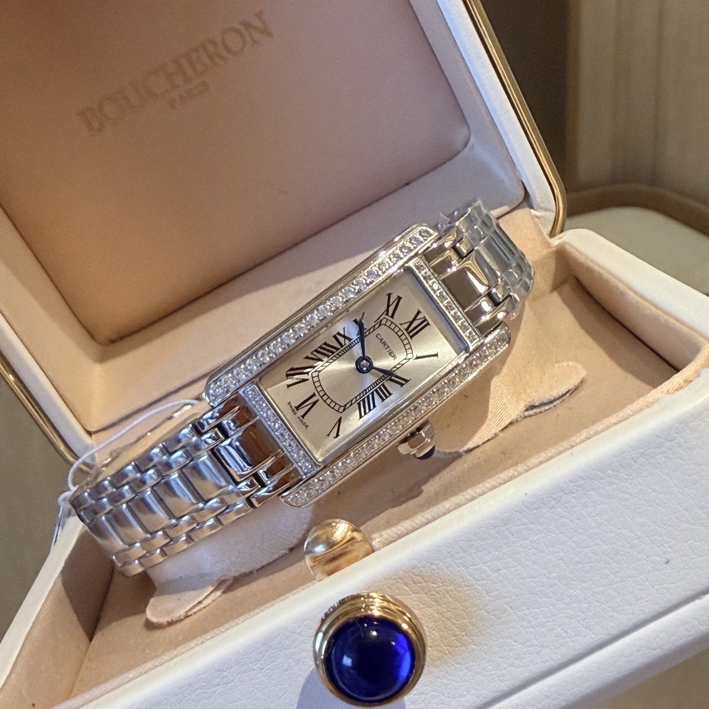 “Cartier Tank Women’s Watch: A Timeless Icon of Empowered Elegance.Born from the geometry of a battlefield tank, reimagined for the modern woman. Its bold rectangular case, whether in polished steel or adorned with a single/double row of diamonds, is a statement of unapologetic sophistication. Roman numerals dance across the dial, a nod to heritage, while the precision movement beats with contemporary spirit. The Tank isn’t just a watch—it’s a legacy you wear, a symbol of strength and grace that transcends eras. For her who defines style on her own terms, the Tank is more than an accessory; it’s a signature.